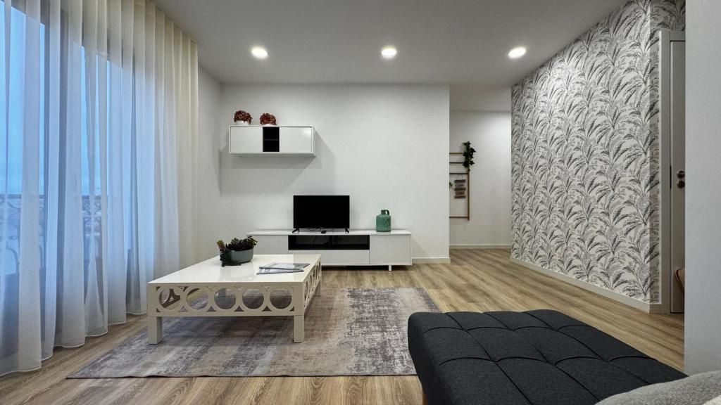 - Sala de estar com sofá e televisão de ecrã plano, canais por cabo e serviço de streaming (ex.: Netflix)